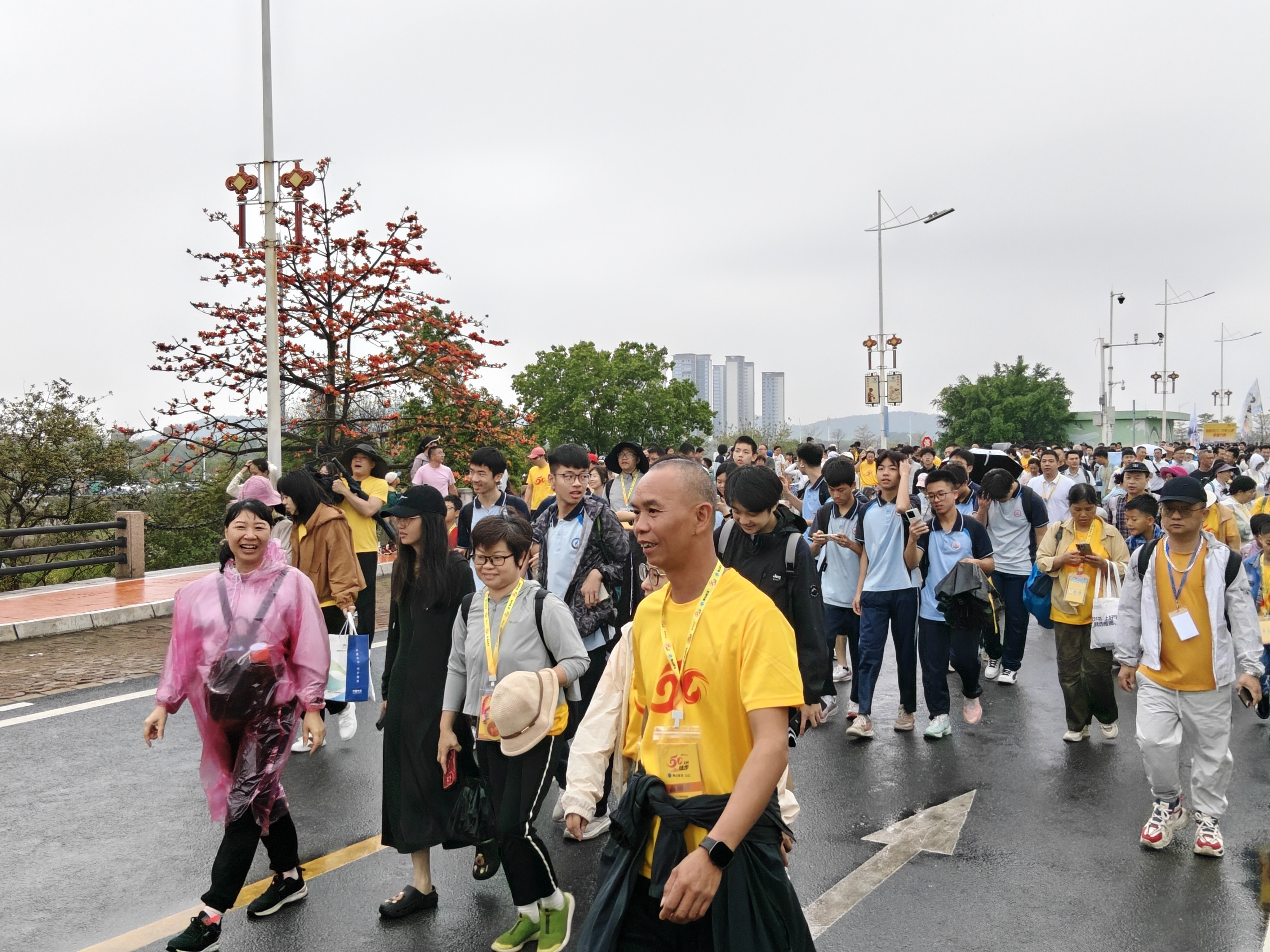 佛山职业技术学院组织近200名师生踊跃参与,学校领导带队参与,师生无惧风雨、步履坚定,展现出一马当先、奋勇向前的昂扬风貌;佛山市高级中学超千名高一学子身着整齐校服,在木棉树、滨江绿道等打卡点驻足合影,班主任与家长志愿者紧随队伍,用镜头记录少年们的灿烂笑颜;佛山二中千余名师生及家长,在烟雨朦胧中丈量家乡美景,用陪伴书写成长温情;澜石中学参与徒步的师生,多数人已是第二次参与,“每年都走远一点、进步一点!”的话语,彰显出坚韧向上的青春风采。