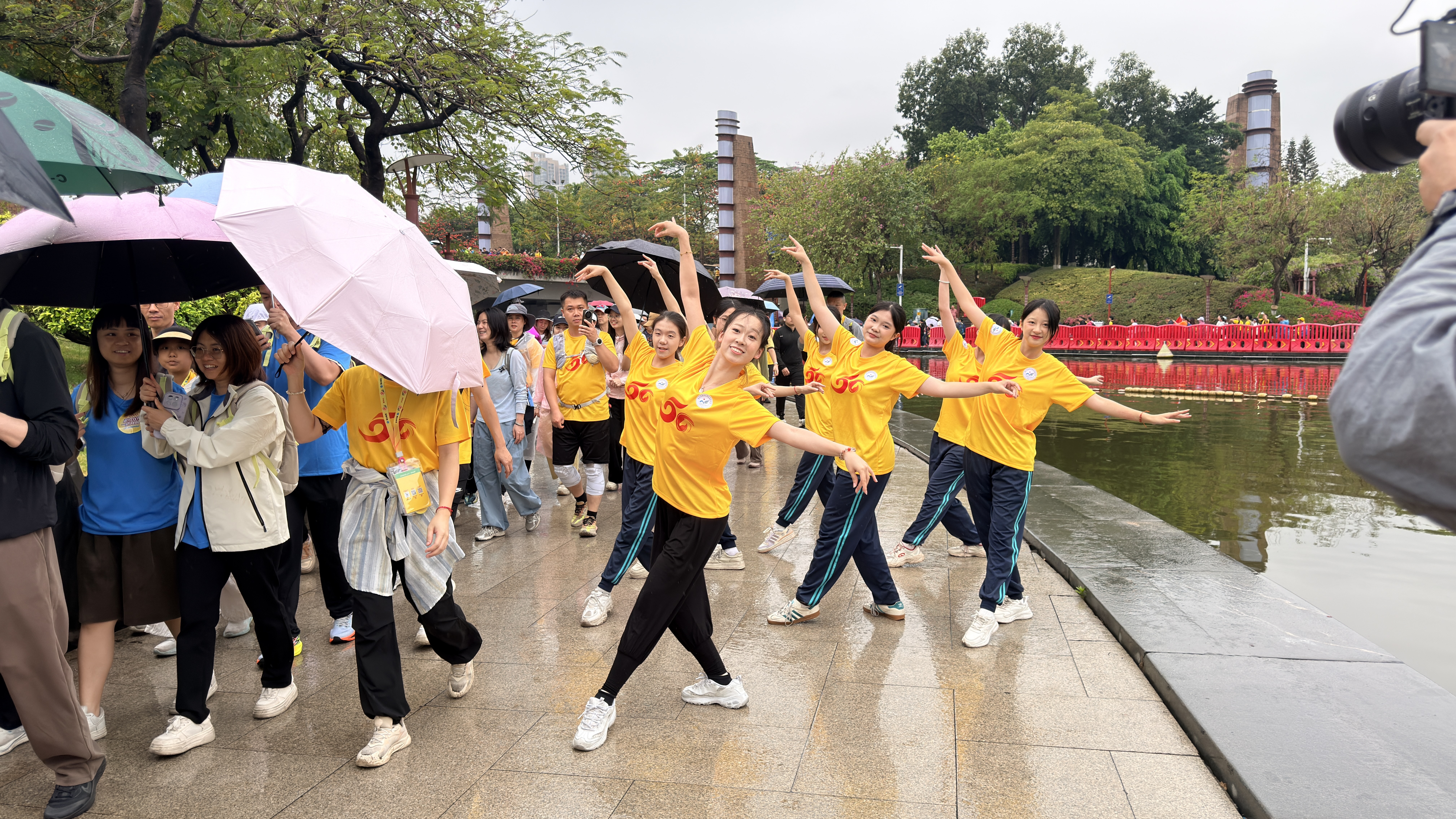 石门中学的少年们踏歌而行、无惧风雨,以青春脚步丈量城市美景,用坚持与协作展现昂扬风貌;南海外国语高级中学打造专属徒步草坪音乐会,学子们轮番献上合唱、管乐等精彩表演,动感旋律与青春气息交织,引得过往市民纷纷驻足观赏;南海区职业高级中学师生在千灯湖畔,用一支《立春》舞蹈快闪唤醒春天,以轻快舞步为徒步队伍加油助威。
