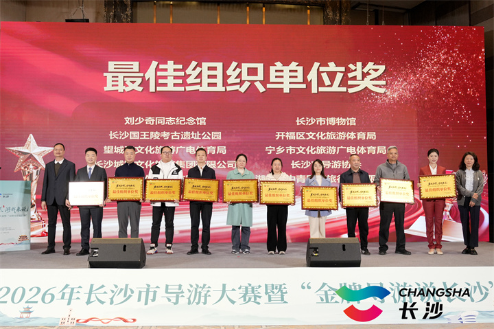大赛共角逐出专业组金奖2名、银奖8名、铜奖9名,以及优秀奖、最佳风采奖、潜力新星奖、最佳组织单位奖、优秀指导老师奖等多个奖项,全面肯定选手、指导教师及组织单位在大赛中的突出贡献。下一步,市文旅广电局将择优推荐,迅速集结优秀选手代表参加2026年湖南省导游大赛,进一步展示长沙导游队伍的专业风采。