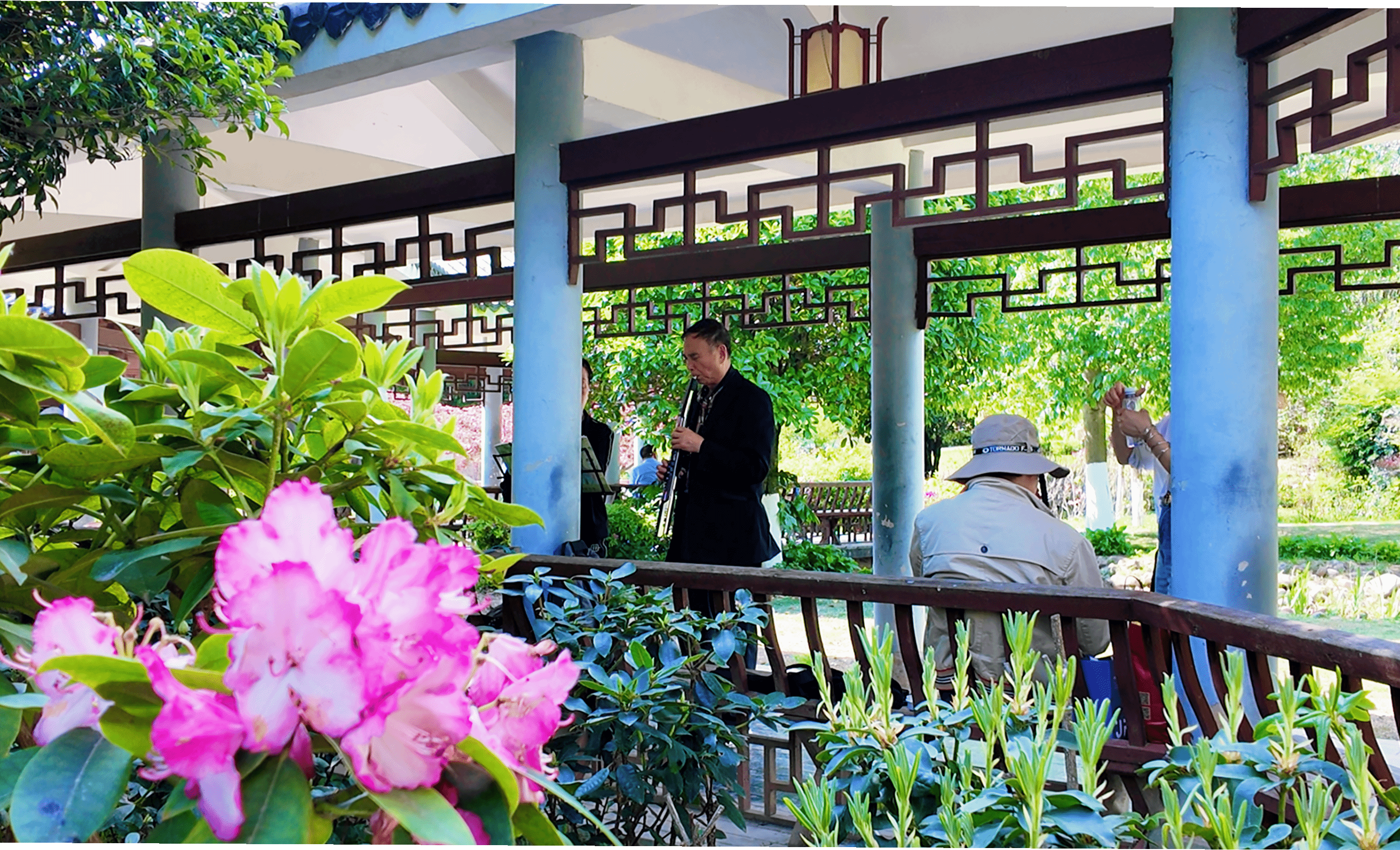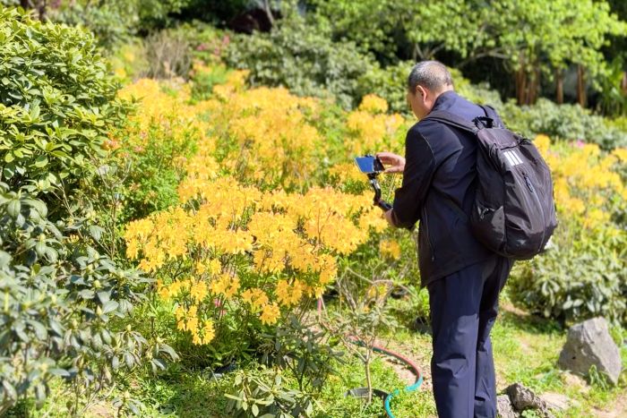 阳光洒落时,各色杜鹃在光影交错间格外动人。花丛中,蝴蝶时而驻足花蕊,时而翩翩起舞;蜜蜂嗡嗡忙碌,为静谧的花园增添了几分灵动。游客三五成群,漫步花径,或拍照打卡,或驻足闻香。现场,不少摄影爱好者还专程携带设备前来,捕捉花海、蝴蝶与古典园林相映成趣的画面。