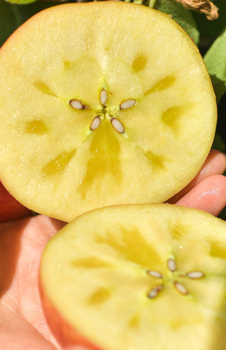 阿克苏冰糖心苹果果芯部位因聚集糖分而形成冰糖心,口感甘甜味厚、汁多无渣,平均可溶性固形物含量高达18°。