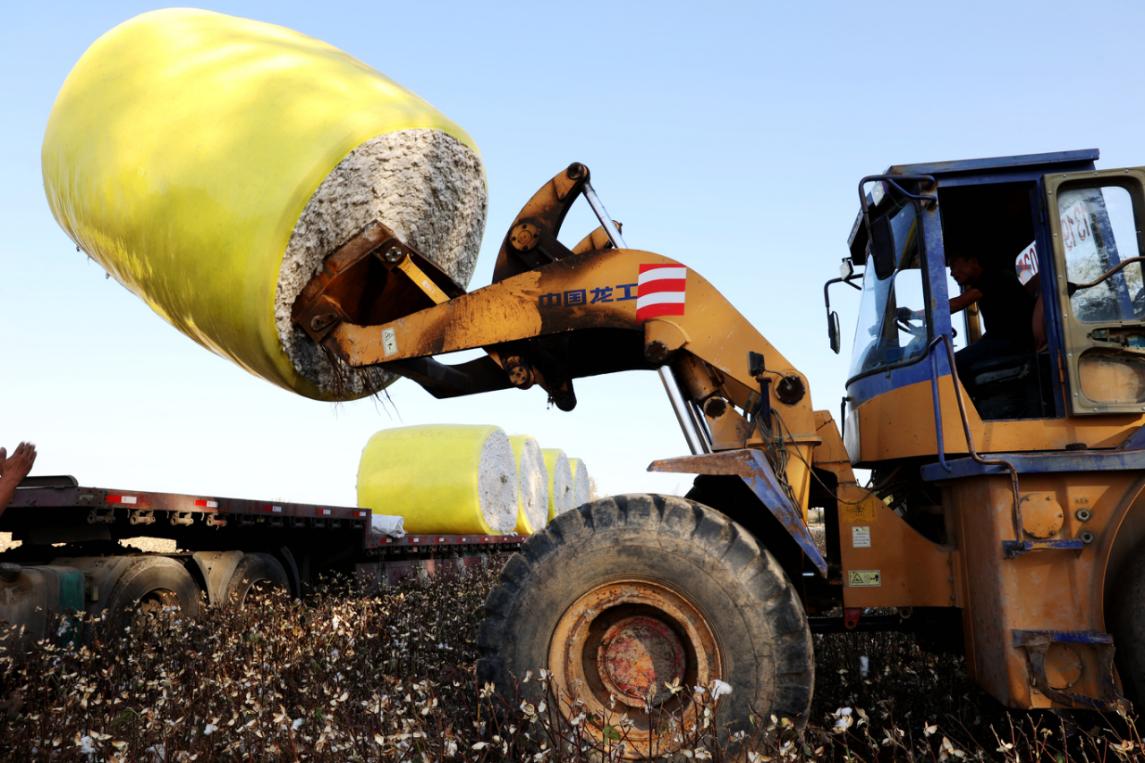 图为在昌吉市榆树沟镇前进村,装载机正在装载棉花。梁宏涛摄