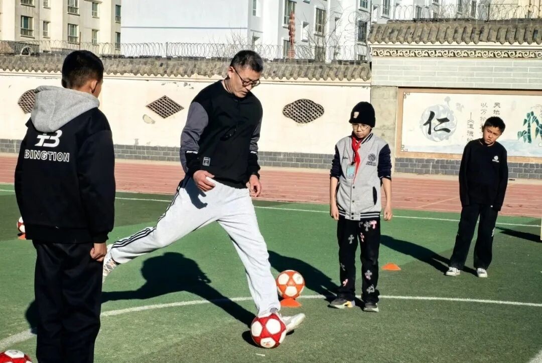 李华向学生示范踢球动作,从基础动作教起,细致纠正每一个姿势。本人供图