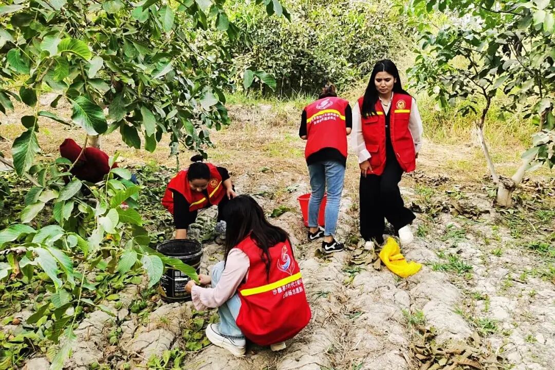 10月5日,沙雅县央塔克协海尔乡铁热克博斯坦村志愿者帮助村民采收核桃。通讯员 刘刚 摄