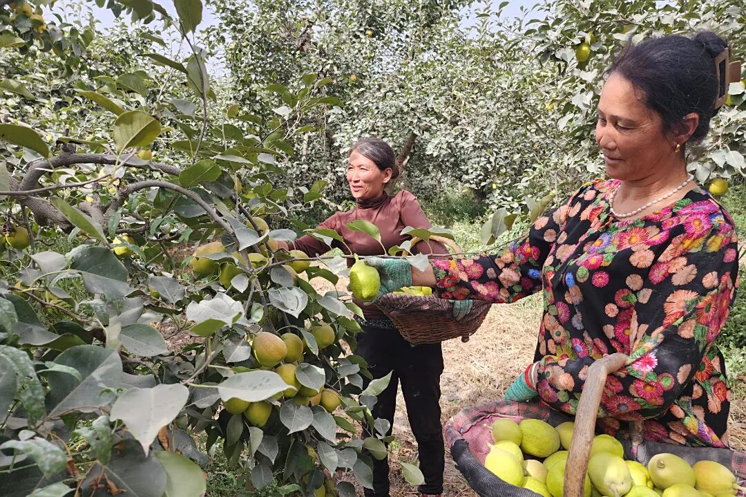10月1日,阿克苏市喀拉塔勒镇萨提村村民忙着采摘香梨。通讯员 范公平 摄
