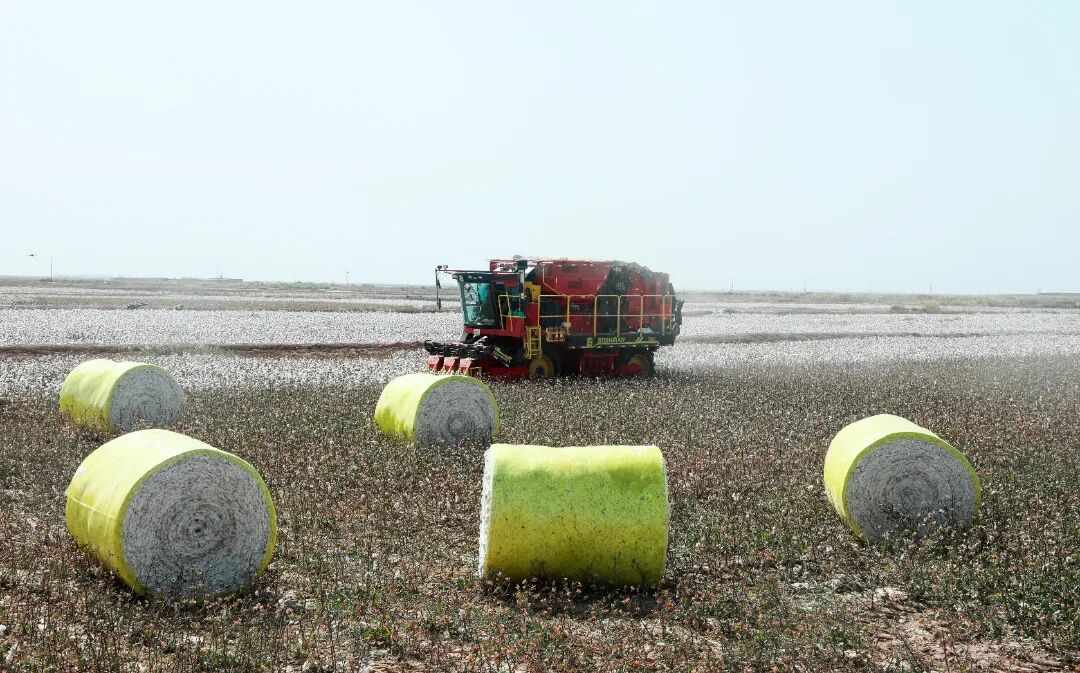 9月28日,采棉机在库车市牙哈镇塔格玛克村一棉田来回穿梭采收棉花。通讯员 吐尔松·托胡提摄
